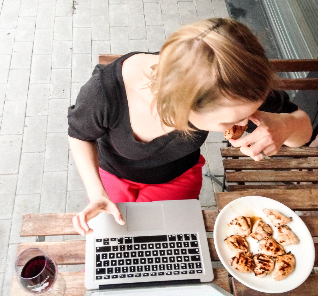 Grillattu-Kanasalaatti-0397Meillä kävi niin, että kotiin kannettujen ”tärkeiden ylitöiden” parissa sohvaan juurtunut äiti raahasi vaivihkaa ja miltei muiden huomaamatta tietokoneensa ja punaviinilasinsa ulos vain parkkeeratakseen puutarhapöydän ääreen, eli  jäähtyvän lihalautasen viereen. Tästä seurasi luonnollisestikin pientä hävikkiä ennen kuin salaatti ehti valmistua.