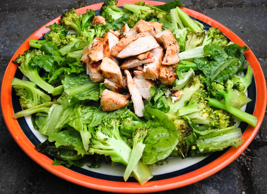 Leikatkaa jäähtyneet parsakaalin kukinnot ruokaveitsellä 2–4 osaan, eli sopiviksi suupaloiksi. Sekoittakaa niiden joukkoon salaattikastike ja antakaa marinoitua sen aikaa, kun grillaatte broilerinpalat. Valuttakaa salaatinlehdet ja nostakaa viileään. Niitä ei kannata sekoittaa parsakaalien joukkoon vielä tässä vaiheessa, jotta ne pysyvät rapeina.