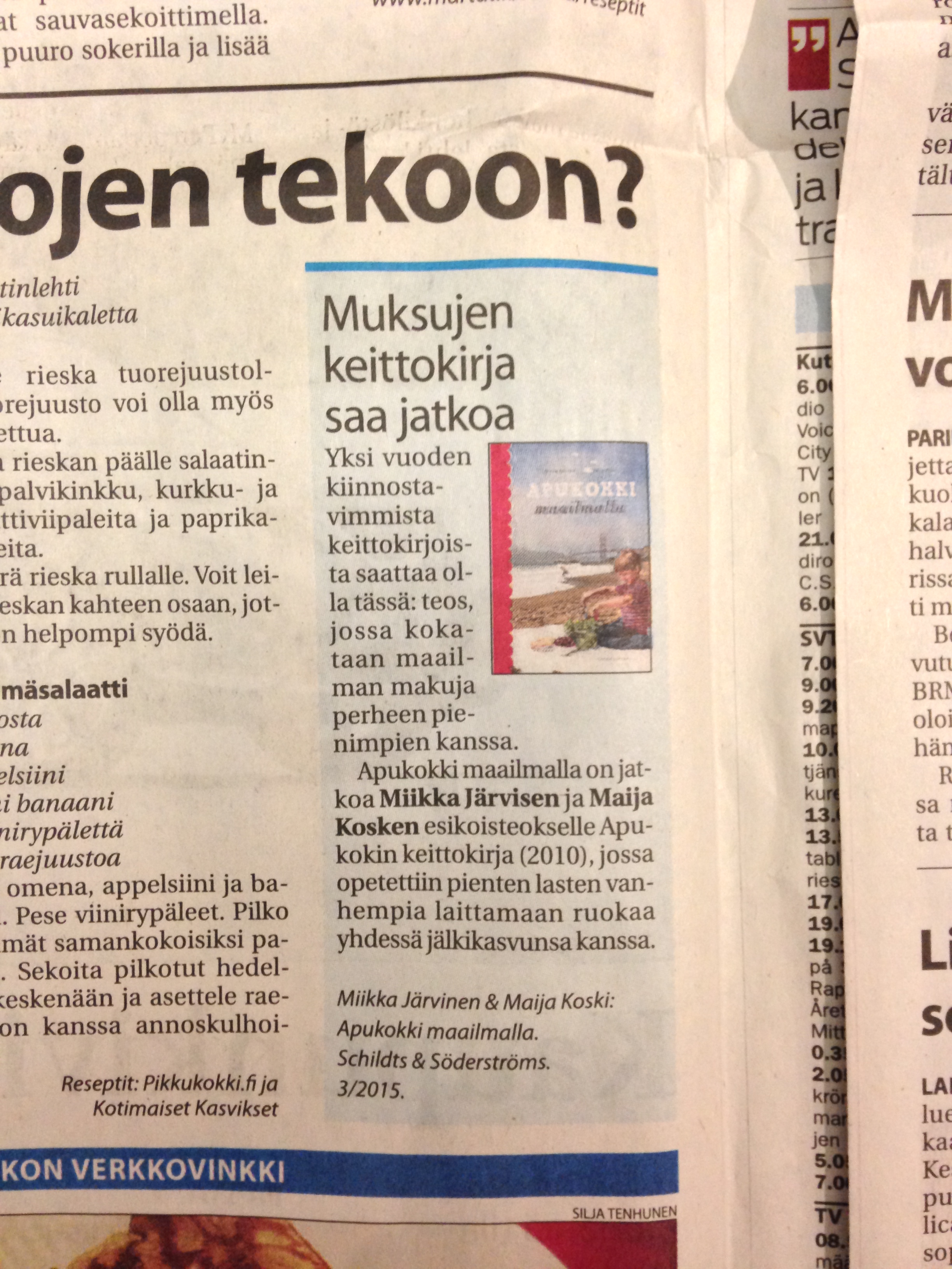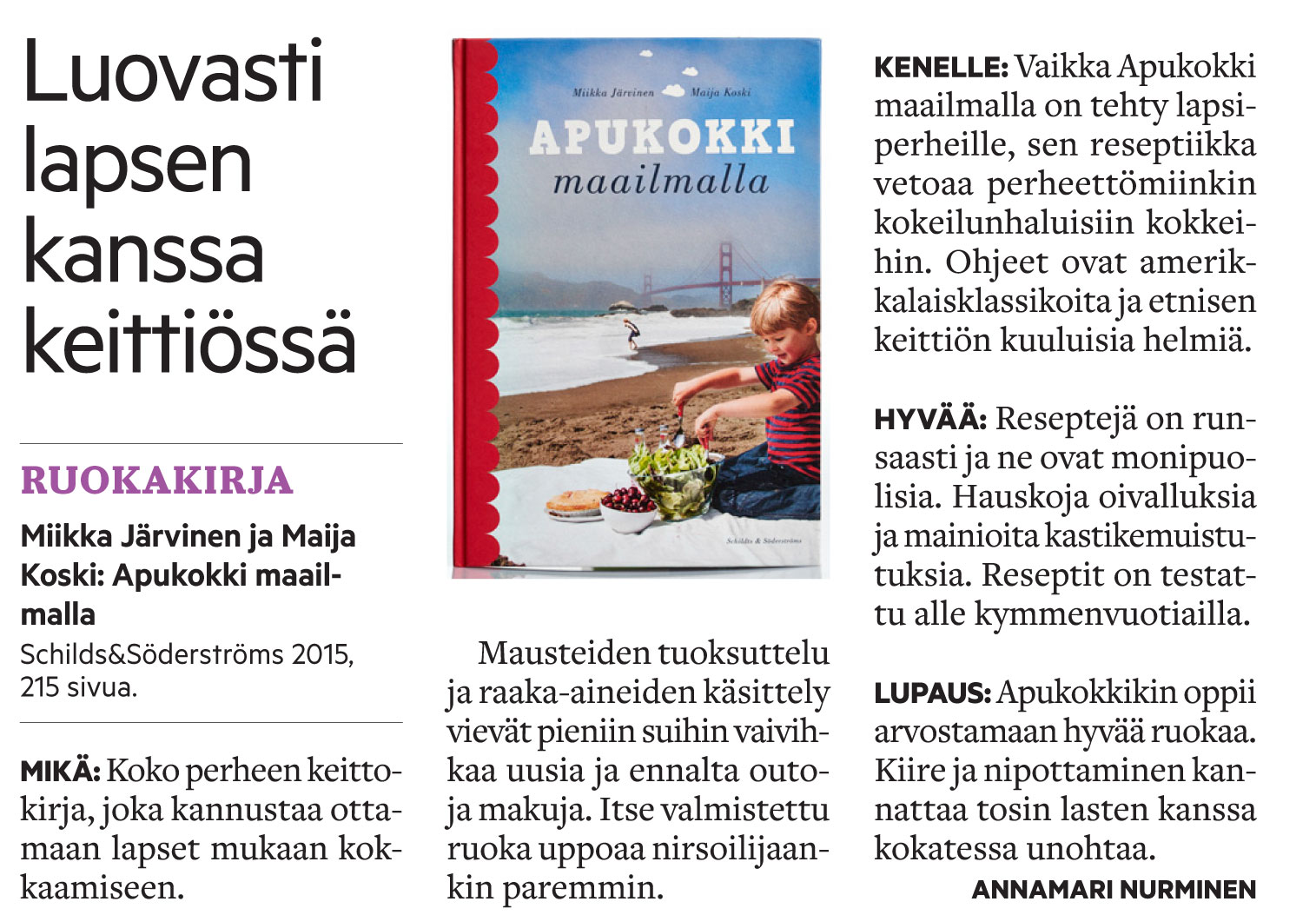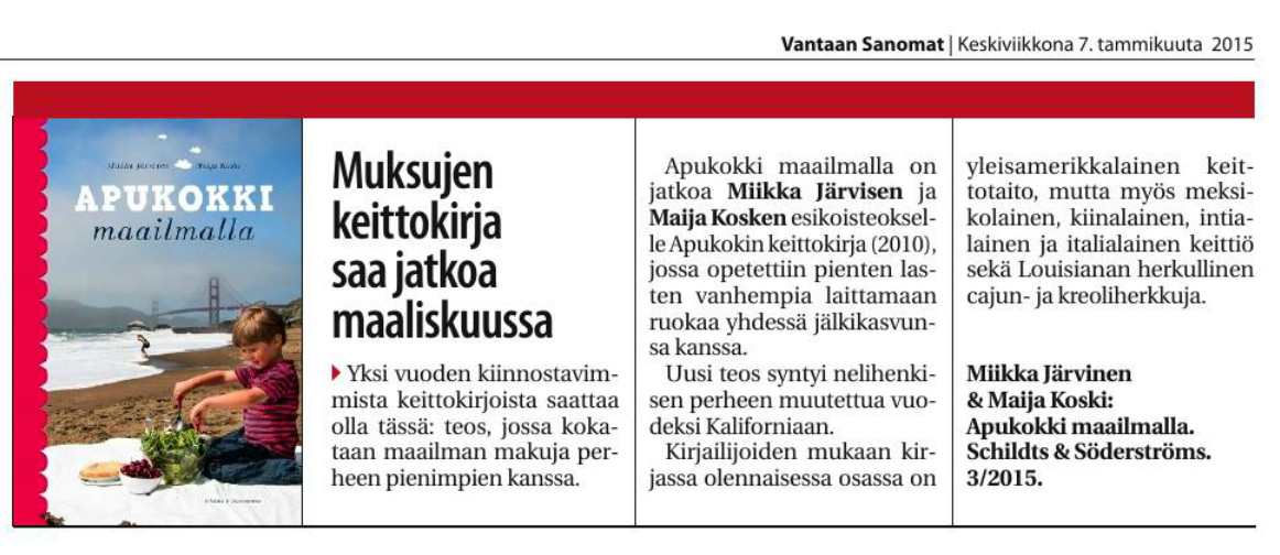 Vantaan sanomat 7.1.2015Yksi vuoden kiinnostavimmista keittokirjoista saattaa olla tässä: teos jossa kokataan maailman makuja perheen pienimpien kanssa.